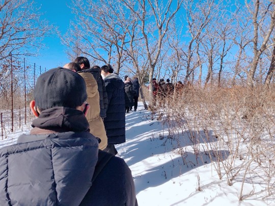 이틑날! 오전 9시부터 백두대간 선자령 트랙킹이 시작되었습니다. 산 입구로 가니 시원하면서도 차가운 바람이 마구 불어오더라구요~ 꽁꽁 싸매고 간 산행이었지만 너무 추워서 직원들을 위해 준비된 따뜻한 핫팩을 양쪽 주머니에 넣고~ 마스크도 쓰고! 산행에 올랐습니다.