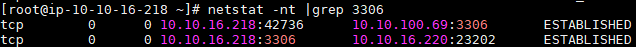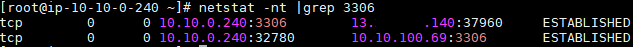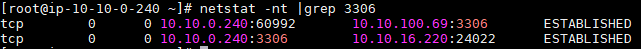 정상접속이 될 때 netstat로 3306/tcp 상태는 아래와 같이 13.xxx.xxx.140 외부접속자의 IP로부터 10.10.0.240:3306 Proxy인스턴스의 내부IP로 맺어진 세션이 다시 10.10.100.69:3306 Aurora Serverless의 노드 IP 중 하나에 연결된 것을 확인할 수 있습니다. Aurora Serverless의 엔드포인트는 각 AZ에 하나의 CNAME으로 노드IP를 제공하는데 노드IP가 변경되어도 haproxy의 resolver에 의해서 자동으로 변경된 노드IP로 연결해 주도록 동작합니다