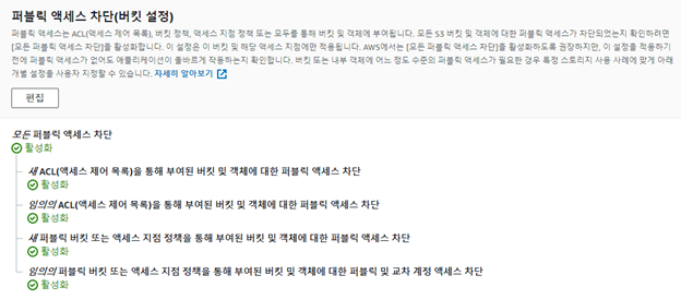 S3의 메인 정책인 ‘퍼블릭 엑세스 차단 정책’은 외부 엑세스에 대해 차단되어 있어도 앞으로 구성할 엔드포인트를 통한 VPC와의 통신에는 문제가 없습니다.