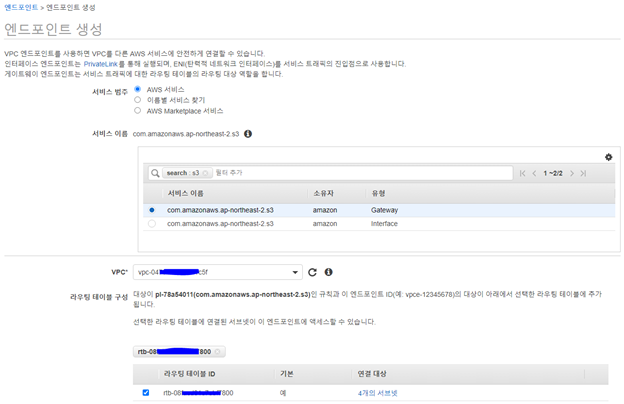 이제 VPC 엔드포인트를 생성하게 되는데, VPC>엔드포인트 메뉴에서 생성할 수 있으며, 아래와 같이 ‘AWS 서비스’를 선택 후, s3를 검색하여 나오는 두개의 서비스 중 유형이 Gateway인 서비스를 선택하고, 원하는 VPC와 서브넷을 선택하고 마지막으로 정책을 선택하는 곳에서는 ‘모든 엑세스’를 선택하여 생성을 완료합니다.