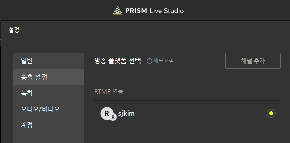 <PRISM Live Studio의 RTMP 채널설정 화면>