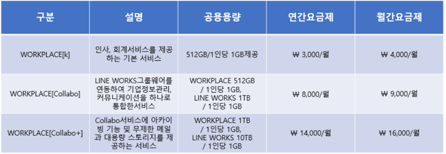 WORKPLACE[k]를 이용하기 위해서는 우선 상품을 선택을 해야합니다. 상품은 WORKPLACE, WORKPLACE[Collabo], WORKPLACE[Collabo+] 총 세 가지의 상품을 제공하고 있으며 상품 변경, 업그레이드, 용량 추가는 이 후에 언제든 가능 합니다. WORKPLACE[Collabo]는 메신저, 실시간푸쉬알림, 필요한 데이터 공유 등 여러가지 LINE WORKS 기능이 추가되어 더 강력한 통합 커뮤니케이션 솔루션을 이용할 수 있습니다.